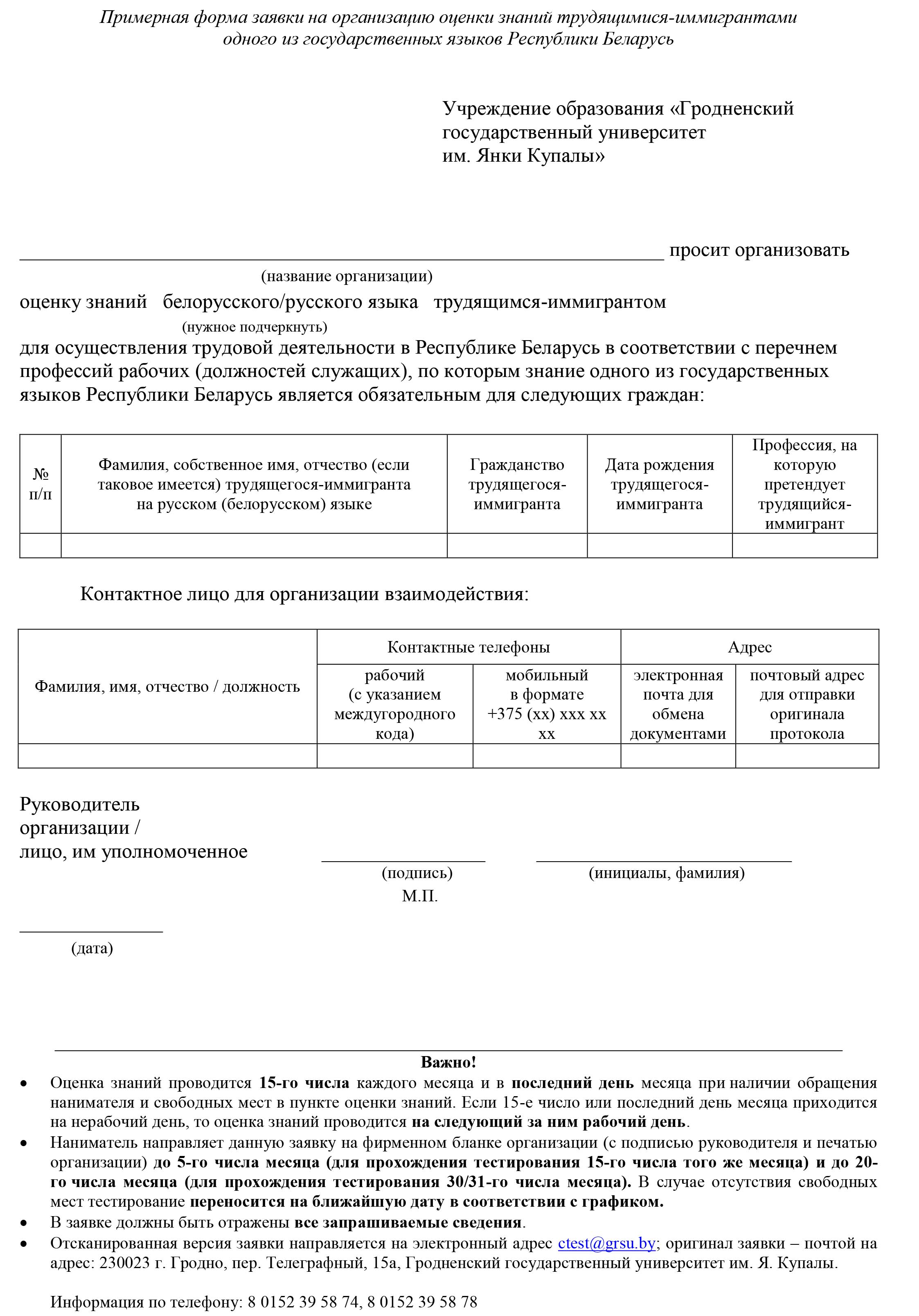 Наниматель до 5-го и 20-го числа каждого месяца обращается в письменной форме в пункт оценки знаний с приложением сведений о трудящемся-иммигранте (гражданство, фамилия, собственное имя, отчество (если таковое имеется) на одном из государственных языков, дата рождения).