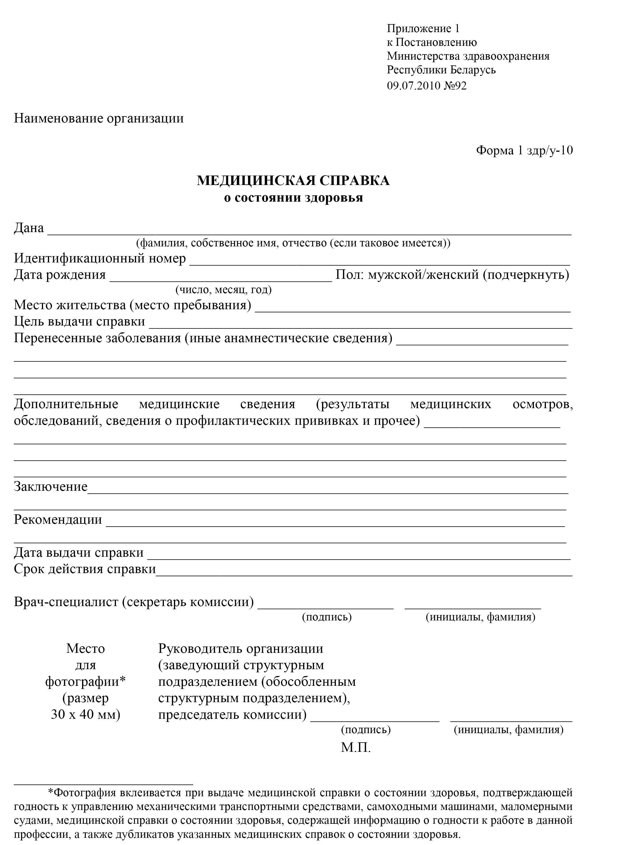 медицинскую справку о состоянии здоровья, подтверждающую отсутствие заболеваний, представляющих опасность для здоровья населения (форма 1 здр/у-10);